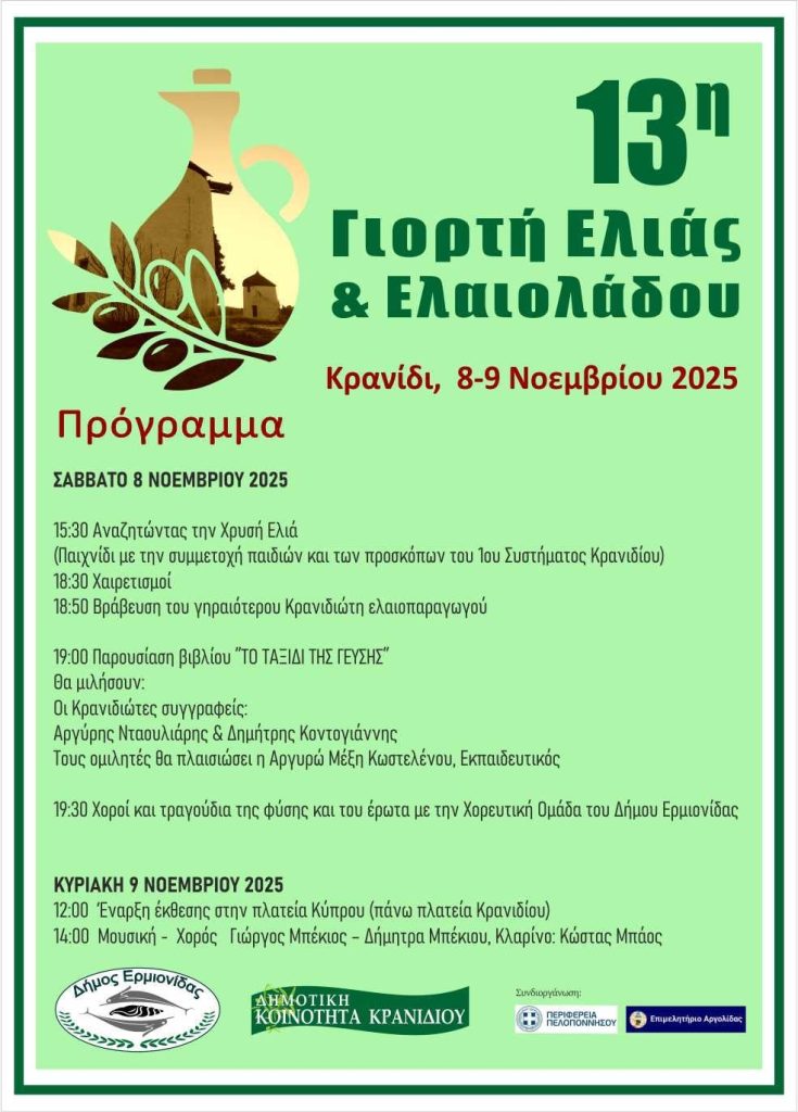 Η 13η Γιορτή της Ελιάς και του Ελαιολάδου επιστρέφει στο Κρανίδι, στο χώρο της Άνω Πλατείας, το Σαββατοκύριακο 8 και 9 Νοεμβρίου 2025.