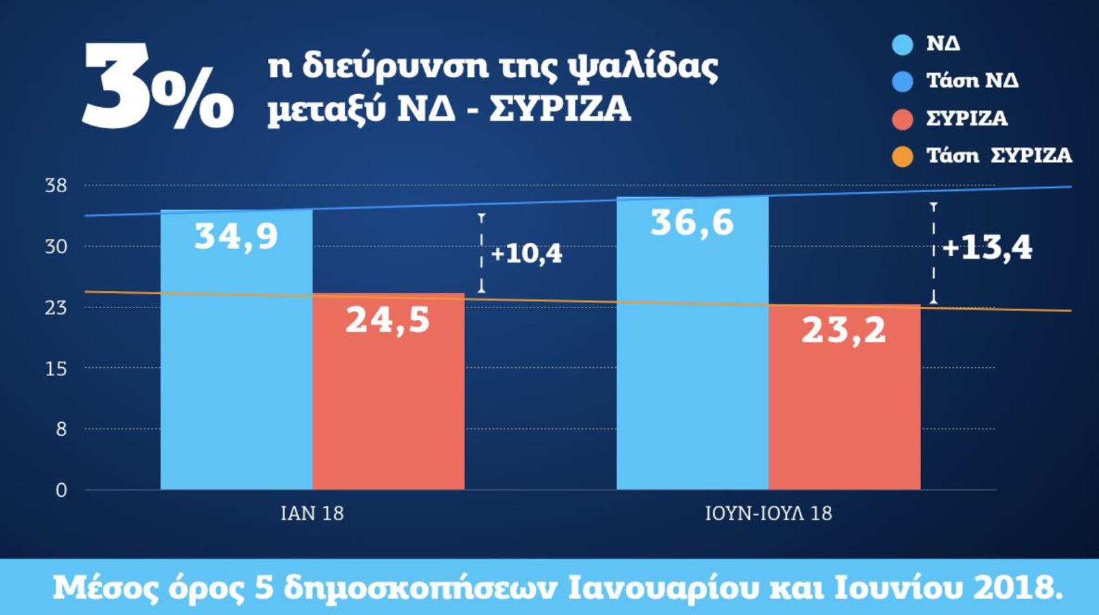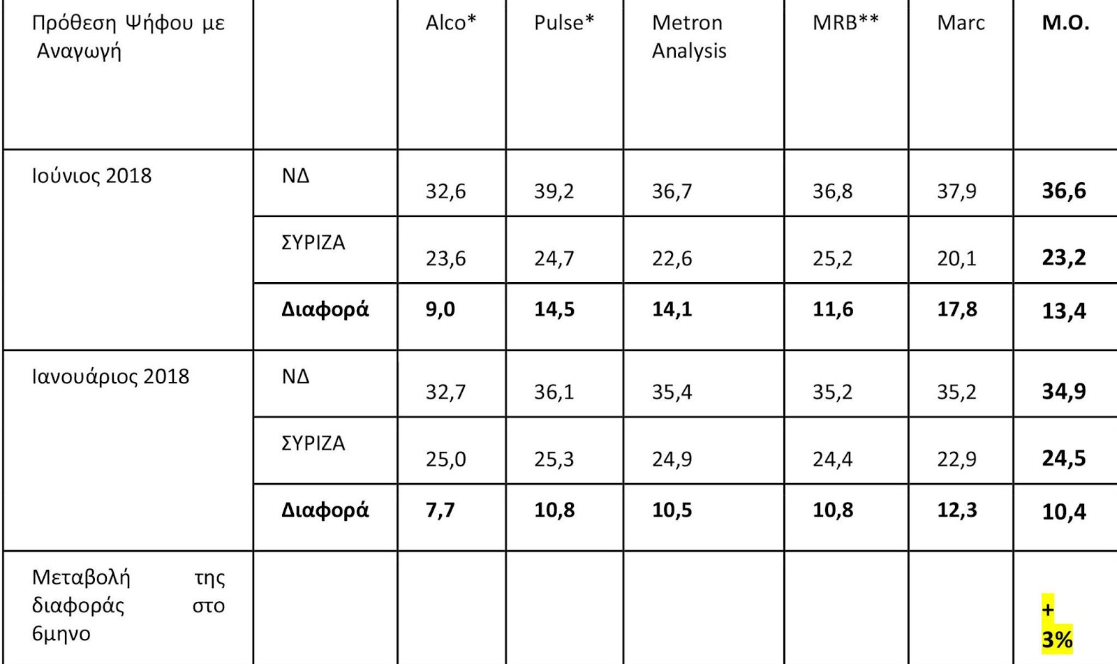 «Ο Μέσος Όρος των 5 τελευταίων δημοσκοπήσεων (Alco, Pulse, Metron Analysis, MRB, Marc) δείχνει τη διαφορά στην εκτίμηση ψήφου να διευρύνεται κατά 3% σε σχέση με τον Ιανουάριο και τη ΝΔ πολιτικά κυρίαρχη και σε τροχιά αυτοδυναμίας.
