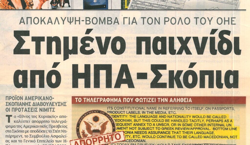 2008: Το σχέδιο Νίμιτς για το Σκοπιανό διαρρέει στην εφημερίδα Το Βήμα. Τα πέντε ονόματα που προτείνει ο διαπραγματευτής του ΟΗΕ: Συνταγματική Δημοκρατία της Μακεδονίας, Λαϊκή Δημοκρατία της Μακεδονίας, Ανεξάρτητη Δημοκρατία της Μακεδονίας, Νέα Δημοκρατία της Μακεδονίας και Δημοκρατία της Άνω Μακεδονίας.
