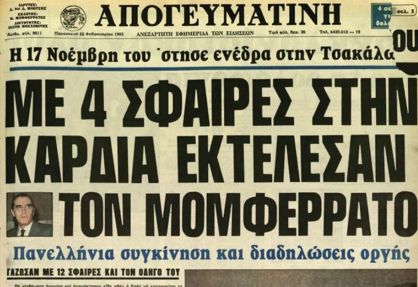 1985: Η ένοπλη οργάνωση «17 Νοέμβρη» δολοφονεί στην οδό Τσακάλωφ στο Κολωνάκι τον εκδότη της εφημερίδας «Απογευματινή», Νίκο Μομφεράτο, και τον οδηγό του, Παναγιώτη Ρουσέτη.