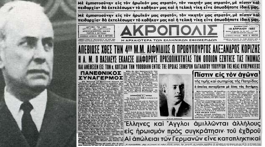 1941: Αυτοκτονεί ο πρωθυπουργός Αλέξανδρος Κορυζής, κάτω από το βάρος των διαγραφόμενων συνθηκών ολικής κατάληψης της χώρας από τους Γερμανούς. Εκείνη την ημέρα συγκαλείται σύσκεψη στο ξενοδοχείο «Μεγάλη Βρετανία». Ο Κορυζής προσφέρεται να παραιτηθεί και έχει μια έντονη συζήτηση με τον βασιλιά. Ξαφνικά σηκώνεται και αποχωρεί από τη σύσκεψη, κατευθύνεται στην οικία του, που βρισκόταν στην οδό Βασ. Σοφίας και κλείνεται στο γραφείο του. Λίγα λεπτά αργότερα καταφτάνει στο σπίτι του ο διάδοχος Παύλος, ο οποίος είχε αντιληφθεί την παράξενη συμπεριφορά του. Δεν προλαβαίνει να χαιρετίσει τη σύζυγό του στο κατώφλι του σπιτιού του και ακούγεται ο πυροβολισμός.