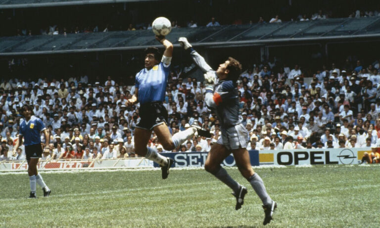 1986: Ο Ντιέγκο Μαραντόνα σκοράρει «Το χέρι του Θεού» και το «γκολ του αιώνα» στο Αργεντινή-Αγγλία 2-1, σε προημιτελικό αγώνα για το Παγκόσμιο Κύπελλο Ποδοσφαίρου 1986, μέσα στο στάδιο «Αζτέκα» στην Πόλη του Μεξικού.