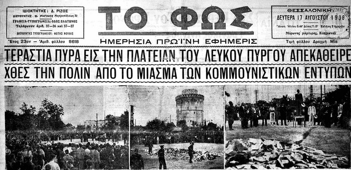 1936: Βιβλία με «ανθελληνικό» περιεχόμενο καίγονται σε κεντρικές πλατείες ελληνικών πόλεων από ανθρώπους της δικτατορίας Μεταξά.