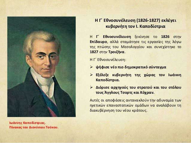 1827: Η Γ’ Εθνοσυνέλευση της Τροιζήνας ορίζει τον Ιωάννη Καποδίστρια ως πρώτο Κυβερνήτη του ελληνικού κράτους.