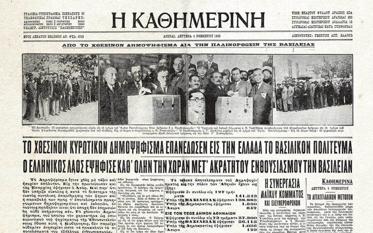 1935: Δημοψήφισμα στην Ελλάδα για την επαναφορά της Μοναρχίας. Το 97,8% ψηφίζει υπέρ και ο Γεώργιος Β’ επανέρχεται στον θρόνο. Τα φαινόμενα που παρατηρούνται ωστόσο μαρτυρούν ότι το δημοψήφισμα δεν έγινε με τίμιους όρους, καθώς σε πολλά εκλογικά τμήματα τα ψηφοδέλτια υπέρ της βασιλείας ξεπέρασαν αριθμητικά το σύνολο των εγγεγραμμένων ψηφοφόρων.