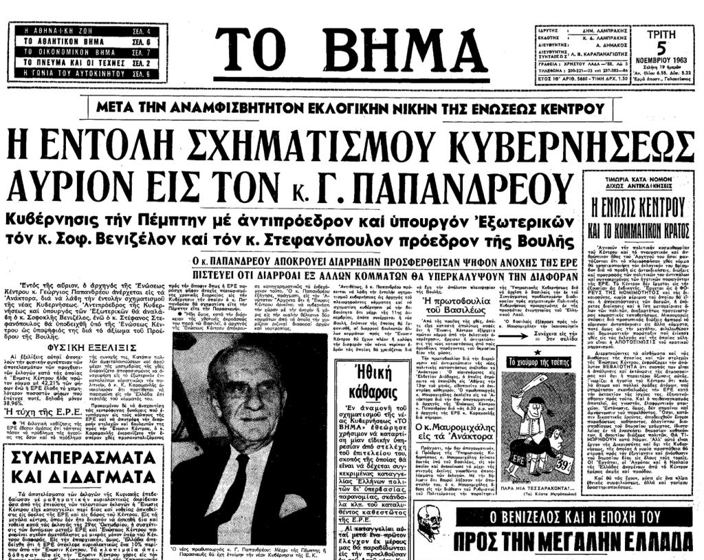 1963: Η Ένωση Κέντρου του Γεωργίου Παπανδρέου κερδίζει τις εκλογές με 42,04% (138 έδρες), περιορίζοντας την ΕΡΕ στο 39,7% (132 έδρες). Με την υποστήριξη της ΕΔΑ θα πάρει ψήφο εμπιστοσύνης και θα σχηματίσει κυβέρνηση.