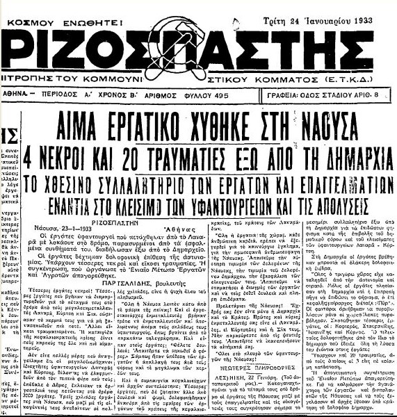 1933: Η χωροφυλακή στη Νάουσα ανοίγει πυρ κατά των 3.000 εργατών που πέταξε ο Λαναράς στους δρόμους και των οικογενειών τους, οι οποίοι διαμαρτύρονταν μπροστά στο Δημαρχείο. Ως αποτέλεσμα 4 εργάτες έπεσαν νεκροί και 20 τραυματίστηκαν. Τα γεγονότα ξεσήκωσαν κύμα διαμαρτυριών σ’ όλη την Ελλάδα.