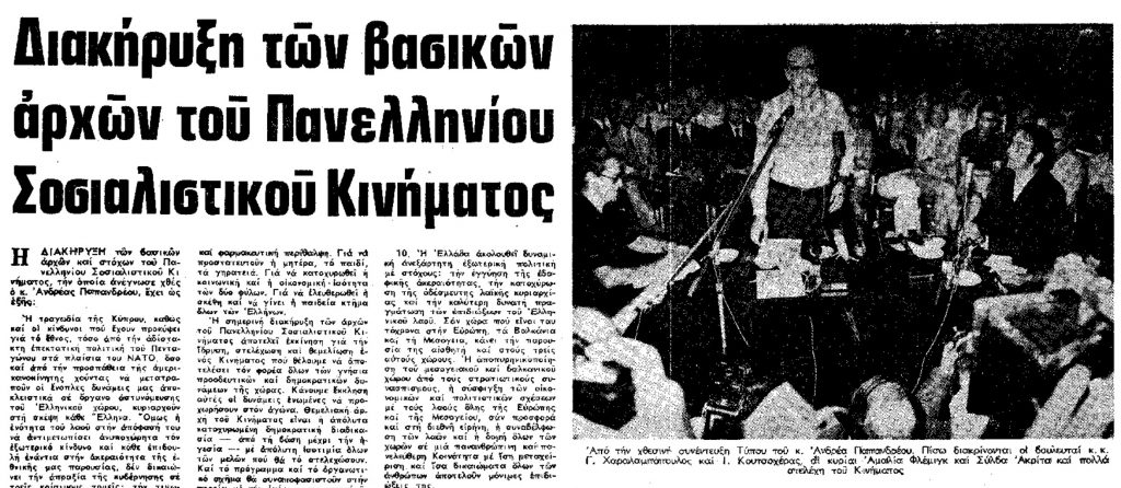 1974: Ιδρύεται το ΠΑΣΟΚ, με ηγέτη τον Ανδρέα Παπανδρέου. Η επίσημη παρουσίαση του νέου κόμματος γίνεται στις 3 Σεπτεμβρίου 1974 στο ξενοδοχείο «King’s Palace» της Αθήνας, παρουσία 150 ατόμων, που αποτελούν τον ιδρυτικό του πυρήνα. Ο Ανδρέας Παπανδρέου εμφανίζεται με καθυστέρηση στην αίθουσα της εκδήλωσης, φορώντας άσπρο πουκάμισο και φαρδιά δερμάτινη ζώνη. Διαβάζει ολόκληρη τη «διακήρυξη αρχών» και στη συνέχεια τη μοιράζει στους παριστάμενους δημοσιογράφους, τυπωμένη σε ένα μικρό πράσινο βιβλιαράκι.
