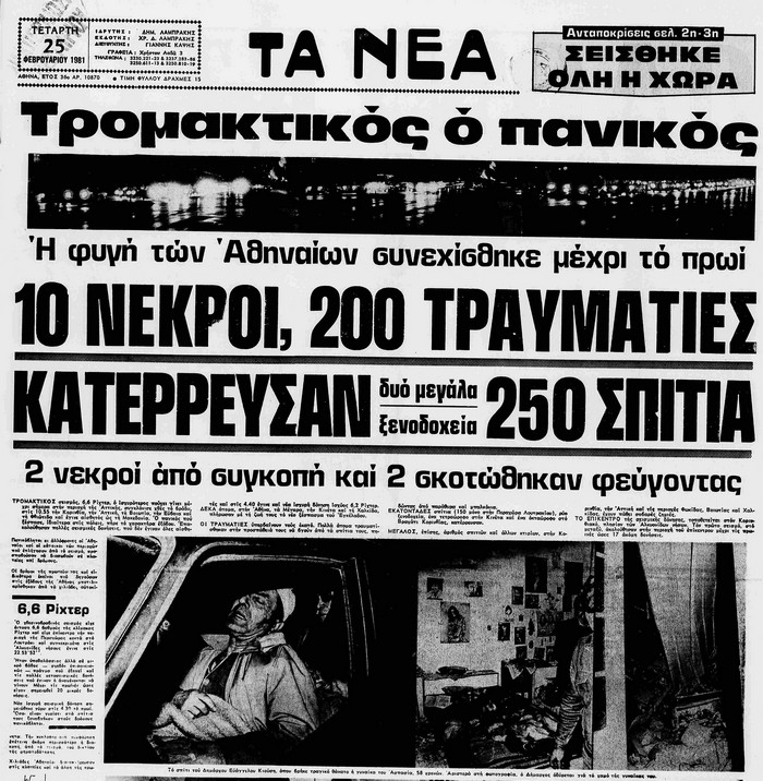 1981: Ισχυρός σεισμός χτυπά τις Αλκυονίδες με 6,7 Ρίχτερ, αφήνοντας πίσω του μεγάλες καταστροφές και τους Αθηναίους να περνούν αρκετά βράδια στα πάρκα και τους δρόμους της πόλης. Ο επίσημος απολογισμός των θυμάτων είναι 20 νεκροί, εκ των οποίων οι περισσότεροι από καρδιακή προσβολή.
