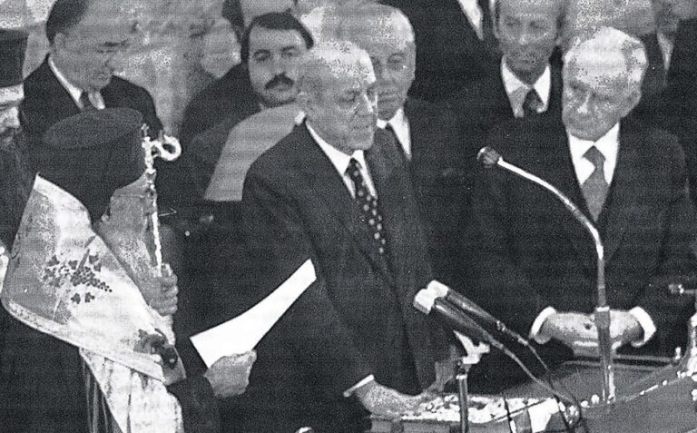 1974: Ο ανώτατος δικαστικός, Μιχαήλ Στασινόπουλος, ορκίζεται προσωρινός Πρόεδρος της Δημοκρατίας, μετά την παραίτηση του στρατηγού Φαίδωνα Γκιζίκη.