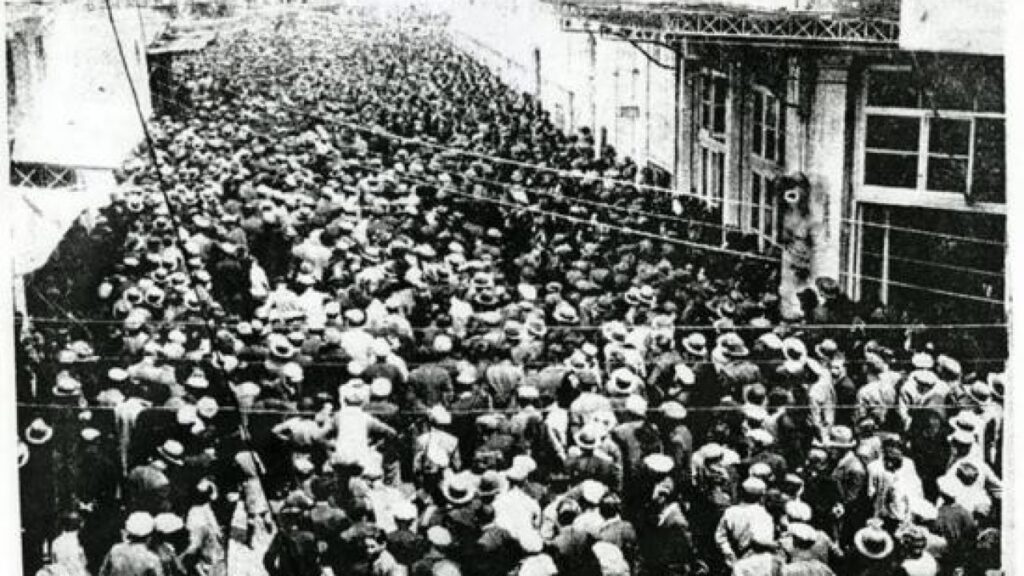 1930: Έλληνες εργαζόμενοι διαμαρτύρονται για την ανεργία. Η μεγάλη οικονομική κρίση του 1929 είχε ως αποτέλεσμα την εκρηκτική αύξηση της ανεργίας σε παγκόσμιο επίπεδο. Από την επόμενη χρονιά αρχίζουν να κλείνουν επιχειρήσεις, η βιομηχανική παραγωγή και η οικοδομική δραστηριότητα μειώνονται, ενώ την ίδια στιγμή πολλά εργοστάσια λειτουργούν μόνο για κάποιους μήνες τον χρόνο. Δεν είναι μόνο η μείωση της εργασίας, τα χαμηλά μεροκάματα και η έλλειψη οποιασδήποτε πρόνοιας για τους ανέργους από την πλευρά του Κράτους, αλλά η ανέχεια και το επιτακτικό ζήτημα επιβίωσης πυροδοτούν εκρηκτικές καταστάσεις, με μεγάλες απεργίες να ξεκινούν, με τον κόσμο να ζητά την εξασφάλιση θέσεων εργασίας και τη χορήγηση επιδομάτων ανεργίας.