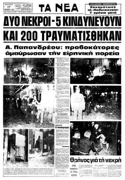 1980: Ο 26χρονος Κύπριος φοιτητής, Ιάκωβος Κουμής, και η 20χρονη εργάτρια, Ματούλα Κανελλοπούλου, χάνουν τη ζωή τους από χτυπήματα των ΜΑΤ, κατά τη διάρκεια επεισοδίων με αφορμή την πορεία για την 7η επέτειο του Πολυτεχνείου.