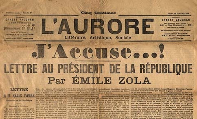 1898: Ο Εμίλ Ζολά δημοσιεύει στην εφημερίδα L’ Aurore μία ανοιχτή επιστολή προς τον πρόεδρο της Γαλλίας, το περίφημο «Κατηγορώ», για την υπόθεση Ντρέιφους.