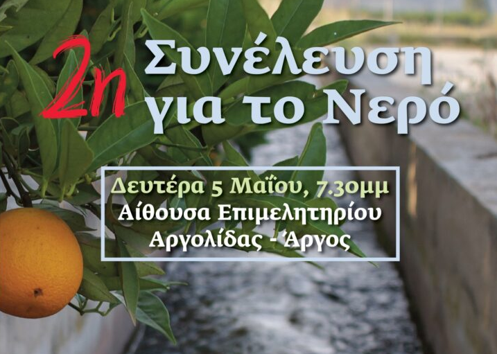 Κάλεσμα για τη 2η Συνέλευση για το Νερό απευθύνει η Επιτροπή Φορέων και Πολιτών για τη σωστή διαχείριση του νερού στην Αργολίδα που θα πραγματοποιηθεί τη Δευτέρα 5 Μάη, στις 19.30, στην αίθουσα του Επιμελητηρίου Αργολίδας.