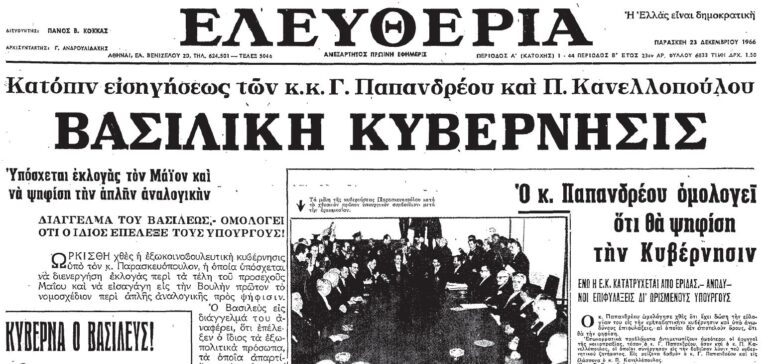 1966: Σε μυστική συνάντηση στα ανάκτορα, παρουσία του βασιλιά Κωνσταντίνου, ο Γεώργιος Παπανδρέου (αρχηγός της Ένωσης Κέντρου) και ο Παναγιώτης Κανελλόπουλος (αρχηγός της ΕΡΕ), καταλήγουν σε συμφωνία για το σχηματισμό μεταβατικής κυβέρνησης με πρωθυπουργό τον Ιωάννη Παρασκευόπουλο, που θα οδηγήσει τη χώρα σε εκλογές στις 28 Μαΐου 1967.