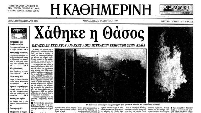 1989: Τεράστια πυρκαγιά στη Θάσο καταστρέφει 70.000 στρέμματα, ενώ οι φλόγες φτάνουν μέχρι και το λιμάνι.