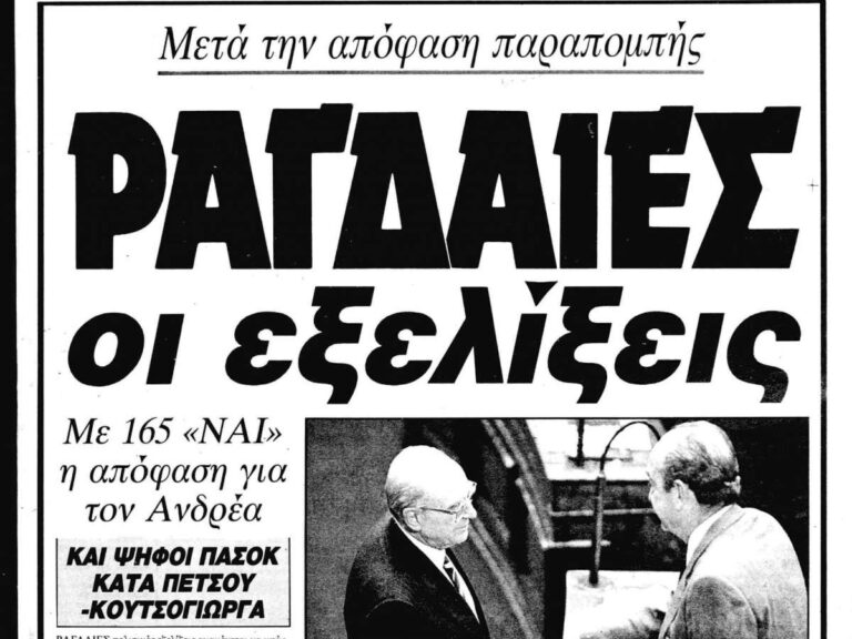 1989: Η Βουλή αποφασίζει την παραπομπή των Ανδρέα Παπανδρέου, Μένιου Κουτσόγιωργα, Γιώργου Πέτσου, Δημήτρη Τσοβόλα και Παναγιώτη Ρουμελιώτη στην Ειδική Ανακριτική Επιτροπή για το σκάνδαλο των ΔΕΚΟ, που κατέθεσαν τα χρήματά τους στην Τράπεζα Κρήτης.