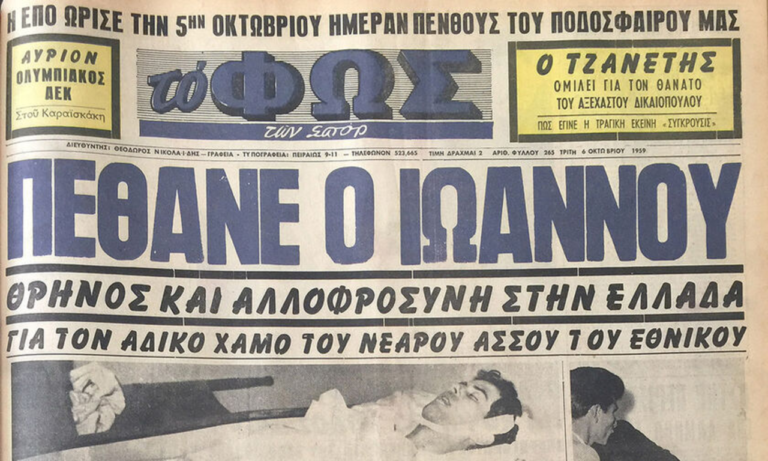 1959: Την τελευταία του πνοή αφήνει ο ποδοσφαιριστής του Εθνικού Πειραιά, Θοδωρής Ιωάννου, ο οποίος την προηγούμενη ημέρα είχε συγκρουστεί με τον τερματοφύλακα του Παναθηναϊκού, Μιχάλη Βουτσαρά, σε φιλικό παιγνίδι μεταξύ των δύο ομάδων.