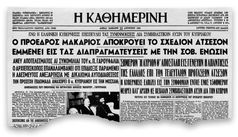 1964: Παρουσιάζεται το Σχέδιο Άτσεσον για την λύση του Κυπριακού. Προβλέπει την ένωση της Κύπρου με την Ελλάδα, έναντι ανταλλαγμάτων για την Τουρκία (Παραχώρηση της Χερσονήσου της Καρπασίας στην Τουρκία ή μίσθωση της Χερσονήσου της Καρπασίας και παραχώρηση του Καστελόριζου στην Τουρκία). Θα απορριφθεί από την ελληνοκυπριακή πλευρά.