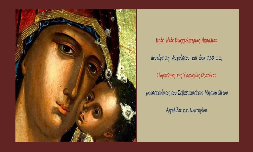 Την Δευτέρα 1η Αυγούστου στις 7.30 μμ θα τελεσθεί Παράκληση της Υπεραγίας Θεοτόκου στον Ιερό Ναό Ευαγγελιστρίας Ναυπλίου χοροστατούντος του Σεβασμιότατου Μητροπολίτη Αργολίδας κκ Νεκταρίου
