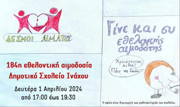 Πώς μπορείς να συμμετάσχεις; Έλα στον Ίναχο, τη Δευτέρα 1 Απριλίου 2024 και ώρα 17:00-19:30 στο Δημοτικό Σχολείο Ινάχου (δείτε το σημείο στο χάρτη). Το Δημοτικό Σχολείο Ινάχου υποστηρίζει την εθελοντική αιμοδοσία και σας καλεί να ενώσουμε τους ΔΕΣΜΟΥΣ ΑΙΜΑΤΟΣ σε μια Πράξη Αγάπης. Οι ΔΕΣΜΟΙ ΑΙΜΑΤΟΣ δεν αποτελούν απλώς ένα σύλλογο, αλλά μια οικογένεια […]