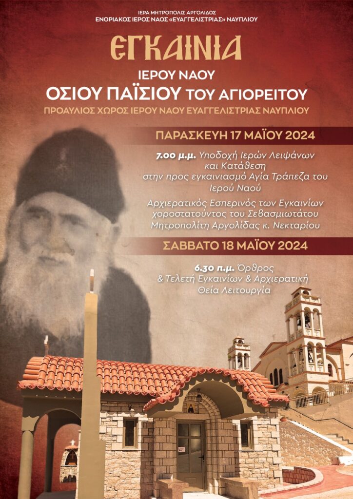 Ανακοινώνεται ότι θα τελεσθούν τα Ιερά Εγκαίνια του νεοαναγειρόμενου Ιερού Ναού του Οσίου Παϊσίου του Αγιορείτου,το οποίο βρίσκεται στον προαύλιο χώρο του Ιερού Ναού ΕΥΑΓΓΕΛΙΣΤΡΙΑΣ Ναυπλίου, σύμφωνα με το ακόλουθο πρόγραμμα: Παρασκευή 17 Μαΐου 2024. Ώρα: 7:00 μ.μ. Υποδοχή Ιερών Λειψάνων και κατάθεση στην προς εγκαινιασμό Αγία Τράπεζα του Ιερού Ναού και στη συνέχεια Αρχιερατικός […]