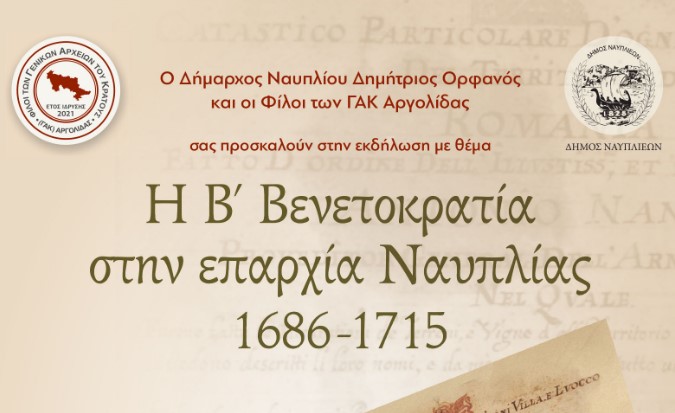 Ο Δήμος Ναυπλιέων και οι Φίλοι των Γενικών Αρχείων του Κράτους (ΓΑΚ) Αργολίδας διοργανώνουν εκδήλωση με θέμα: Η Β’ Βενετοκρατία στην επαρχία Ναυπλίας 1686-1715,