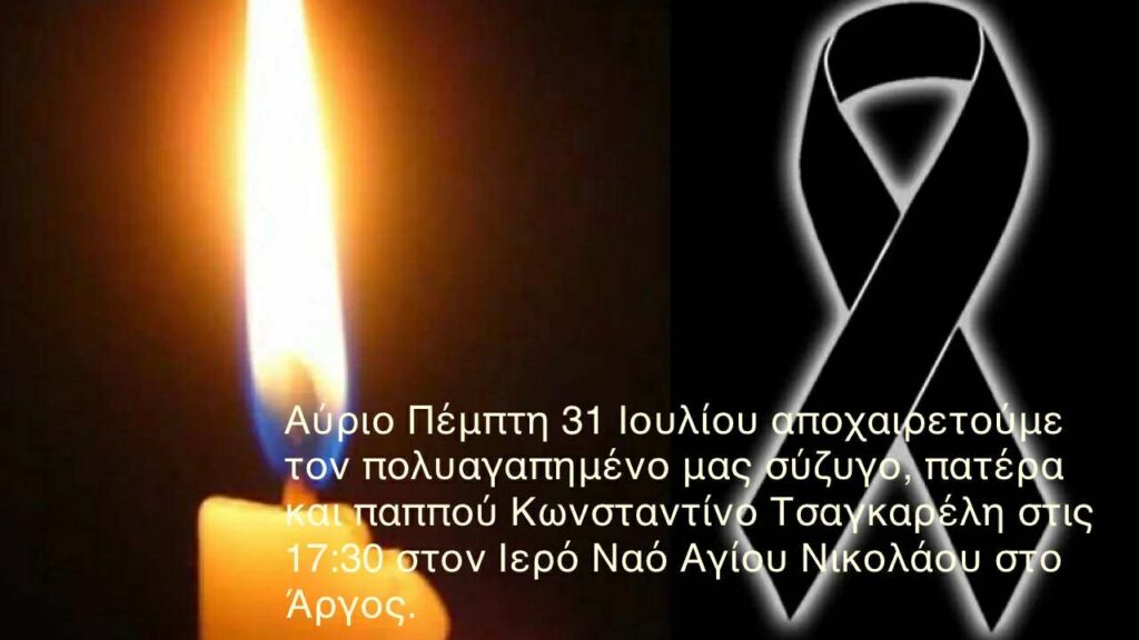 Αύριο Πέμπτη 31 Ιουλίου αποχαιρετούμε τον πολυαγαπημένο μας σύζυγο, πατέρα και παππού Κωνσταντίνο Τσαγκαρέλη, στις 5.30 το απόγευμα στον Ιερό Ναό Αγίου Νικολάου, στο Άργος