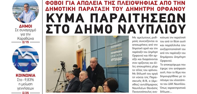 Το κύμα παραιτήσεων που χαρακτηρίζει την πορεία της δημοτικής αρχής είναι το βασικό θέμα της έντυπης Αργολικής Ανάπτυξης που κυκλοφορεί