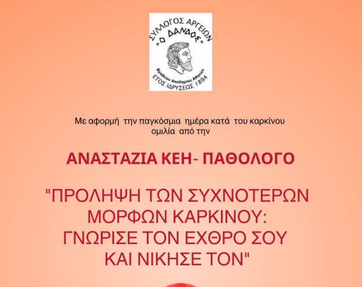 Ο Σύλλογος Αργείων ο Δαναός, με αφορμή την Παγκόσμια Ημέρα κατά του Καρκίνου, σας προσκαλεί σε μια ομιλία – σταθμό για τη θωράκιση της υγείας μας