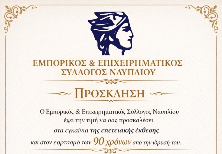 Ο Εμπορικός & Επιχειρηματικός Σύλλογος Ναυπλίου έχει την τιμή να σας προσκαλέσει στα εγκαίνια της επετειακής έκθεσης και στον εορτασμό των 90 χρόνων