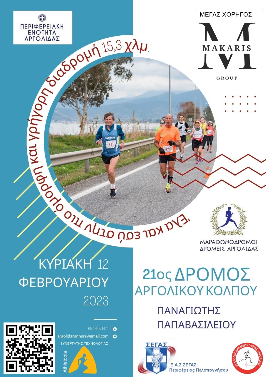 Ο Σύλλογος «ΜΑΡΑΘΩΝΟΔΡΟΜΟΙ ΔΡΟΜΕΙΣ ΑΡΓΟΛΙΔΑΣ» (μέλος Ε.Ο.Σ.Λ.Μ.Α –Υ) σε συνεργασία με την Περιφερειακή Ενότητα Αργολίδας, τον Σύλλογο Δρομέων Υγείας Αργολίδας και την ΕΑΣ ΣΕΓΑΣ Περιφέρειας Πελοποννήσου, προκηρύσσουν: τον 21ο Δρόμο Αργολικού Κόλπου.