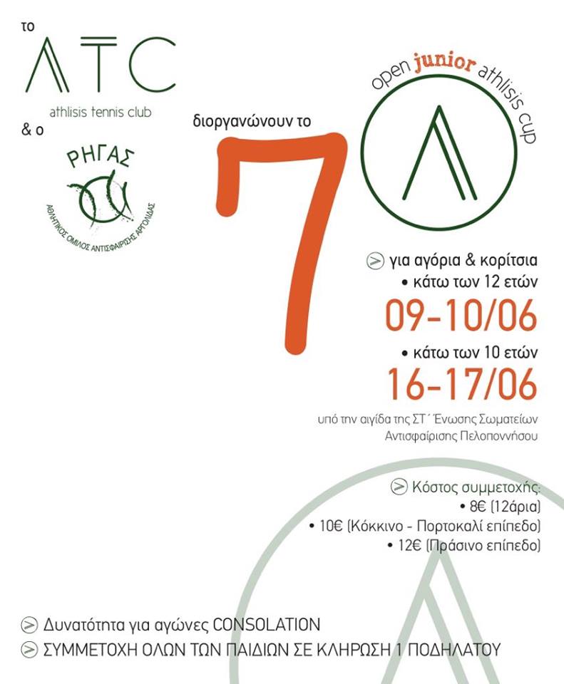 Για έβδομη συνεχή χρονιά οι μικροί αθλητές και αθλήτριες θα έχουν την δυνατότητα να συμμετάσχουν στο “OPEN JUNIOR ATHLISIS CUP 2018”, που διοργανώνει το Athlisis Tennis Club και ο “ΡΗΓΑΣ” – ΑΟΑΑ σε συνεργασία με την ΣΤ΄ Ένωση Σωματείων Αντισφαίρισης Πελοποννήσου.