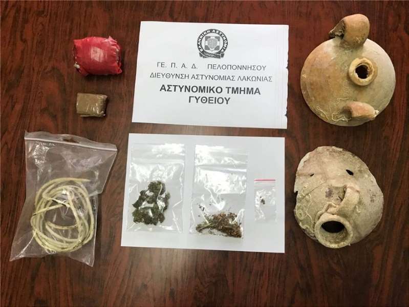 μήκους 2,31 μέτρων και ακατέργαστη κάνναβη βάρους 10,8 γραμμαρίων. Τα αρχαία αντικείμενα εξετάστηκαν από αρχαιολόγο, κρίθηκε ότι εμπίπτουν στις προστατευτικές διατάξεις της νομοθεσίας και θα σταλούν στην αρμόδια αρχαιολογική υπηρεσία.