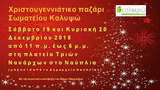 Το Χριστουγεννιάτικο παζάρι του Σωματείου Υποστήριξης Ασθενών με Ψωρίαση Καλυψώ τα φετεινά Χριστούγεννα θα γίνει στο Ναύπλιο. Το Καλυψώ συμμετέχει στο Χριστουγεννιάτικο παζάρι του δήμου Ναυπλιέων, ο οποίος παραχωρεί τη πλατεία Τριών Ναυάρχων (μπροστά από το Δημαρχείο Ναυπλίου) για το σκοπό αυτό. Τα παζάρι θα υλοποιηθεί το Σάββατο και τη Κυριακή 19 & 20 Δεκεμβρίου 2015, από τις 11 το πρωί έως τις 6 το απόγευμα.