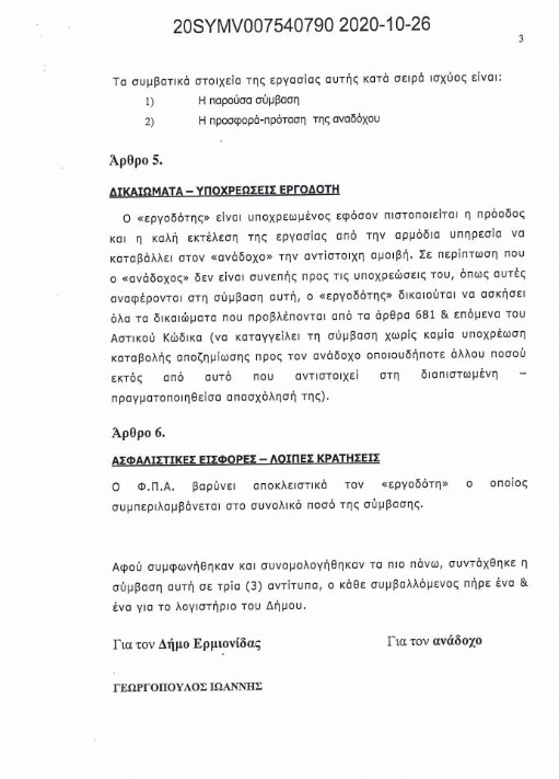 Ο Δήμος ανέθεσε στην κυρία Σταματίνα Δρούζα, Δικηγόρο, σύζυγο του κυρίου Λάμπρου, με απευθείας ανάθεση, απόλυτα νόμιμη και με διαφανή και νόμιμο τρόπο, ύψους μέχρι 18.000 ευρώ, ανάλογα με τις υπηρεσίες που θα παρασχεθούν, την υποβολή δικαιωμάτων της Δ.Ε Κρανιδίου στο Κτηματολόγιο και να εκτελέσει «…οποιαδήποτε άλλη εργασία…» και «…η αμοιβή θα υπολογιστεί με βάση τον αριθμό των δηλώσεων που θα υποβληθούν στο κτηματολόγιο και τις λοιπές συναφείς εργασίες που μπορεί να ανατεθούν στην ανάδοχο…», όπως ακριβώς αναφέρεται στην τροποποιημένη σύμβαση που υπογράφηκε στις 2/2/2021 μεταξύ της δικηγόρου και του Δήμου. Στις 17/6/2021 ο άμισθος ειδικός σύμβουλος, υπεύθυνος για θέματα κτηματολογίου, κύριος Δημαράκης απέστειλε με e mail στην κυρία Δρούζα όλα τα απαραίτητα έγγραφα που του είχε ζητήσει και αφορούν τη διαθήκη του αείμνηστου Κωνσταντίνου Δημότση, όπως ο ίδιος με έχει ενημερώσει. Επειδή μέχρι τις 26/7/2021 ο κύριος Δημαράκης δεν είχε πάρει απάντηση, όπως με ενημέρωσε, απέστειλε εκ νέου στην κυρία Δρούζα δύο e mail. Στο μεν πρώτο αποστέλλει για δεύτερη φορά τα αιτούμενα έγγραφα και ζητάει από τη δικηγόρο να προτείνει στο Δήμαρχο, δηλαδή σε εμένα, τις ενέργειες που πρέπει να γίνουν για τη μεταγραφή της δωρεάς. Στο δε δεύτερο e mail δίνει εντολή και ζητάει μεταξύ άλλων από τη δικηγόρο να διενεργήσει έρευνα για τα ακίνητα του Δήμου τα οποία είτε έχουν μεταγραφεί είτε όχι από το 2011 και μετά σύμφωνα με τη σύμβαση που έχει υπογράψει η κυρία Δρούζα στις 2/2/2021. Στις 2/9/2021 η κυρία Δρούζα απάντησε με e mail προς τον κύριο Δημαράκη το οποίο έχει λάβει και αριθμό πρωτοκόλλου 6548/6453/3/9/2021 και το οποίο κοινοποίησε και σε εμένα μεταξύ άλλων αποδεκτών. Στο e mail αυτό αναγράφει ότι για την κληρονομία του Κωνσταντίνου Δημότση, απαιτείται συμβολαιογραφική αποδοχή αυτής από το Δήμο Ερμιονίδας και μεταγραφή της συμβολαιογραφικής αυτής πράξης στο Υποθηκοφυλακείο Μάσσητος. Γι αυτό απαιτείται να προσληφθεί συμβολαιογράφος που θα αναλάβει τη σχετική διαδικασία. Η κυρία Δρούζα όπως όλοι γνωρίζουμε στη μικρή τοπική μας κοινωνία, είναι μια αξιόλογη δικηγόρος με επαρκή επιστημονική κατάρτιση. Για το λόγο αυτό, η απάντησή της στις 2/9/2021 που προαναφέρω ήταν βαρύνουσας σημασίας για την εν λόγω υπόθεση. Ο Δήμος δηλαδή, διόρισε δικηγόρο προκειμένου να τον κατευθύνει και να τον καθοδηγήσει καλύπτοντας από νομικής πλευράς και σύμφωνα με τη σύμβαση και την τροποποίηση αυτής και την εντολή του κυρίου Δημαράκη, προς τα συμφέροντα του Δήμου. Έτσι, η αναφορά μου ότι δεν έχει γίνει μεταγραφή της κληρονομίας του αείμνηστου Κωνσταντίνου Δημότση στηρίχθηκε απολύτως στη γραπτή δήλωση της νομικής συμβούλου του Δήμου για το συγκεκριμένο θέμα. Η παραπάνω λανθασμένη, όπως αποδείχτηκε από τον κύριο Λάμπρου, αναφορά της κυρίας Δρούζα, κρίνω ότι οφείλεται σε αμέλεια ;