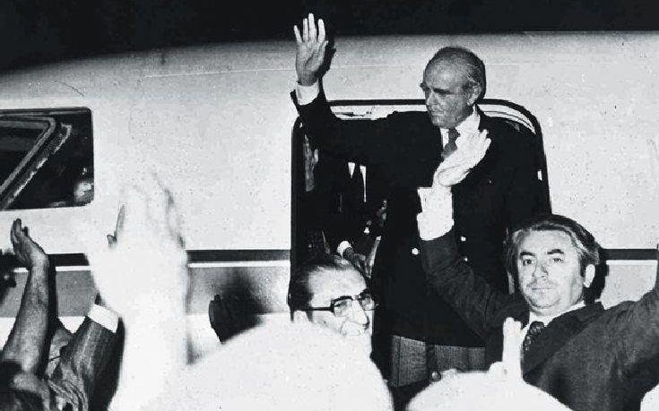 1974: Καταρρέει η δικτατορία. Αποφασίζεται ο σχηματισμός πολιτικής κυβέρνησης υπό τον Κωνσταντίνο Καραμανλή, που βρίσκεται στο Παρίσι. Ο πρόεδρος της Γαλλίας, Ζισκάρ ντ’ Εσταίν τού διαθέτει το προσωπικό του αεροσκάφος για την άμεση επιστροφή του. Στο αεροδρόμιο του Ελληνικού, χιλιάδες λαού τον υποδέχονται στις 2 π.μ. Στις 4:15 π.μ. ο Κωνσταντίνος Καραμανλής ορκίζεται πρωθυπουργός μπροστά στο στρατηγό Φαίδωνα Γκιζίκη. Η μεταπολίτευση είναι γεγονός.