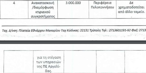 Υπάρχει ένας αυστηρός όρος , το σχέδιο θα κατατεθεί το Οκτώβριο , θα εκγκριθεί τον Απρίλιο του 2021 και θα μπορεί να θεωρηθεί μόνο μια φορά , τον Απρίλιο του 2022 Τα έργα που αφορούν την Αργολίδα είναι τα ακόλουθα :