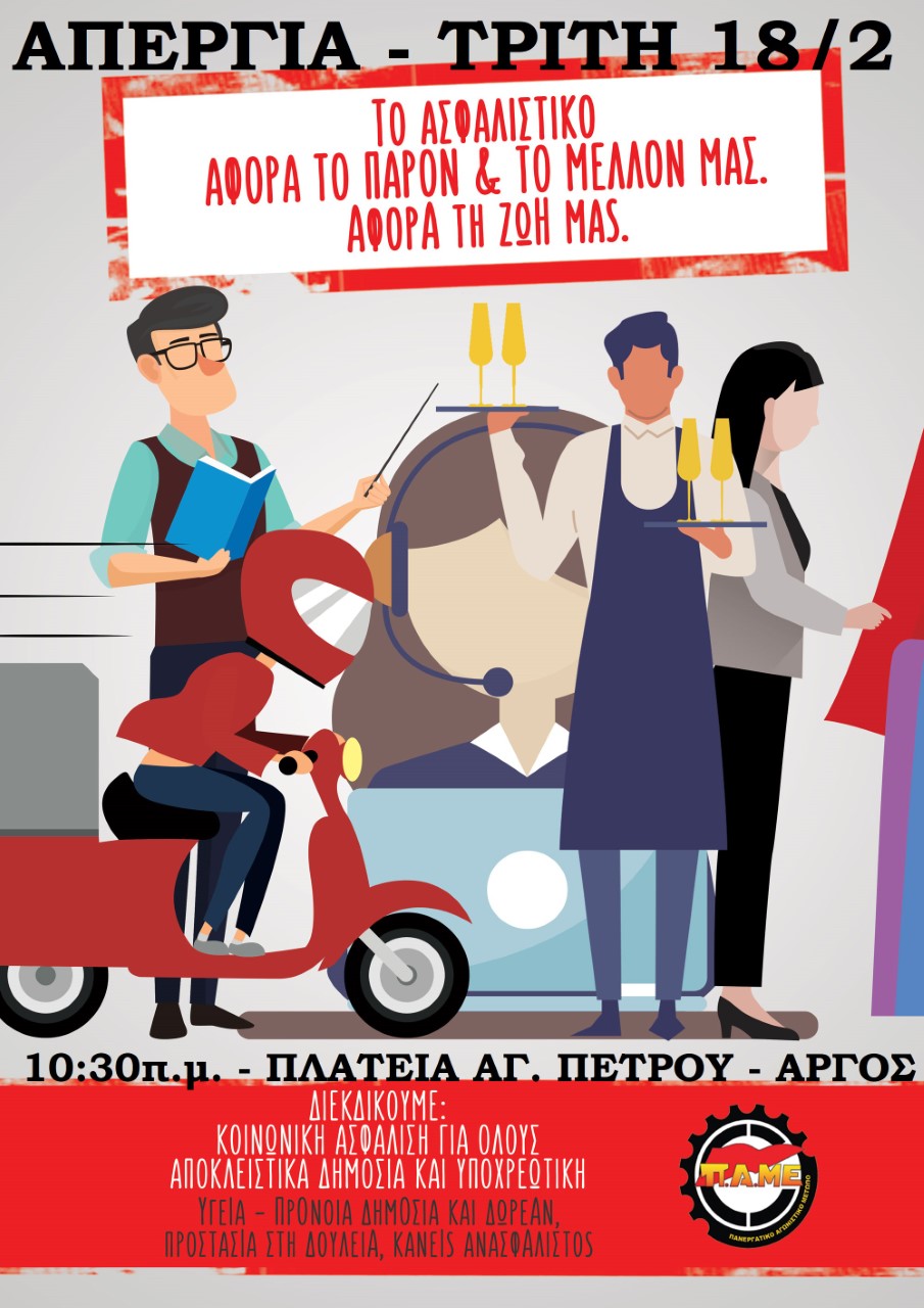Τροφίμων καı Ποτών να οργανωθεί στο ταξικό κλαδικό Συνδικάτο μας, να δυναμώσει η φωνή υπεράσπισης των συμφερόντων της τάξης μας μέσα στο συνδικαλιστικό κίνημα καı να απομονωθούν οι ξεπουλημένο εργατοπατέρες που έχουν κατσικωθεί στο σβέρκο της εργατικής τάξης! Αντίστοιχες ευθύνες έχουν και οι ηγεσίες των ντόπιων εργατικών κέντρων που δεν έχουν βγάλει άχνα για το ασφαλιστικό και δεν έχουν κάνει την παραμικρή ενέργεια οργάνωσης των εργαζομένων προκειμένου να αντιπαλέψουν την αντεργατική λαίλαπα. Έχουν μετατρέψει τα εργατικά κέντρα σε άψυχα κουφάρια που πουλάνε ζαρζαβατικά. Υπονομεύουν ξεκάθαρα την απεργία και με τη στάση τους εκπληρώνουν το βρώμικο ρόλο που τους έχουν αναθέσει κυβέρνηση – εργοδοσία. Η σιγή νεκροταφείου που επιδιώκουν στην Αργολίδα ΔΕΝ ΘΑ ΠΕΡΑΣΕΙ!