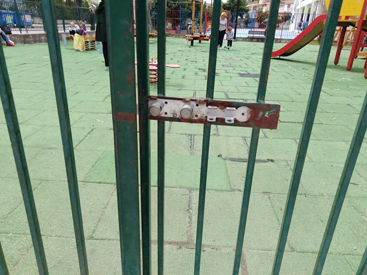 στο χώρο της παιδικής χαράς (η ταμπέλα που έχει τοποθετηθεί από το δήμο είναι