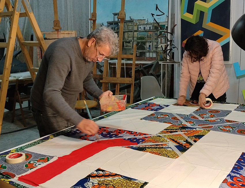 Κατά τη διάρκεια της φιλοξενίας, οι δύο δημιουργοί συνεργάστηκαν σε ένα νέο έργο πάνω στο ύφασμα Wax, ένα υλικό που, παρότι σήμερα θεωρείται σύμβολο «αφρικανικότητας», έχει ευρωπαϊκή ιστορική προέλευση. Όπως υπογράμμισε ο Romlì, το Wax σχεδιάστηκε και παρήχθη αρχικά στην Ολλανδία για τις αφρικανικές αποικίες και το χαρακτήρισε παράδειγμα πολιτισμικού «βραχυκυκλώματος». Πάνω σε αυτή τη χρωματική επιφάνεια, η Aicha Abouhaj χάραξε ένα γεωμετρικό μοτίβο εμπνευσμένο από τα βερβερικά τατουάζ, ενεργοποιώντας μια πράξη επαναδιεκδίκησης της πολιτισμικής μνήμης. Το έργο τους μετατράπηκε σε έναν ποιητικό διάλογο ανάμεσα στο «κατασκευασμένο» βλέμμα της Δύσης και στις ζωντανές ρίζες μιας παράδοσης που εξελίσσεται δυναμικά. Η σύμπραξη Romlì και Abouhaj, καρπός της δεκαπενταετούς καλλιτεχνικής τους πορείας, άνοιξε ένα ευρύτερο πεδίο διερώτησης γύρω από τις ταυτότητες, τη μνήμη, την πολιτισμική μεταφορά και τις κοινωνικές μεταμορφώσεις που διατρέχουν το σύγχρονο Μαρόκο.
