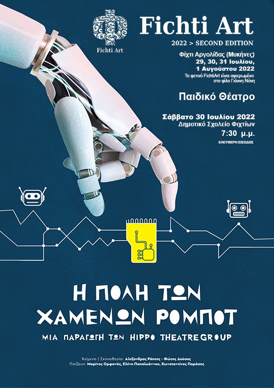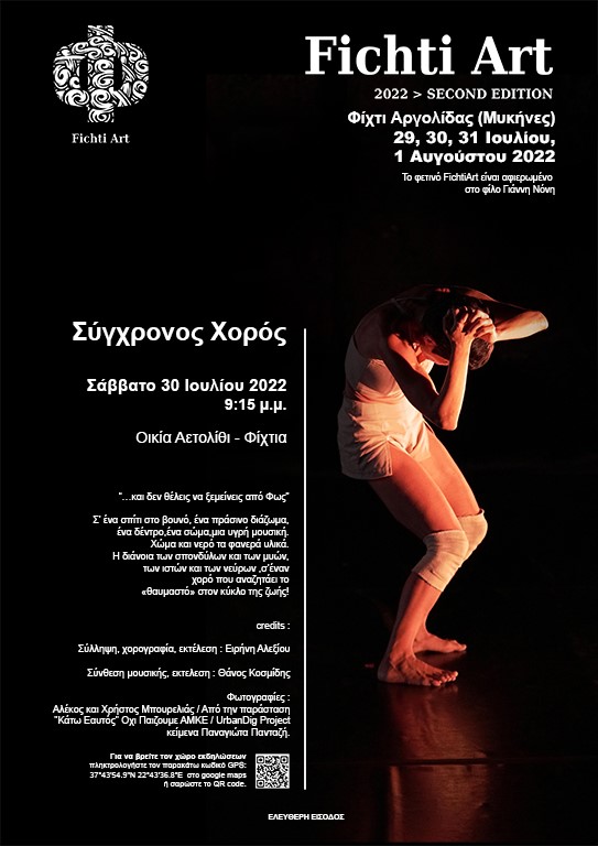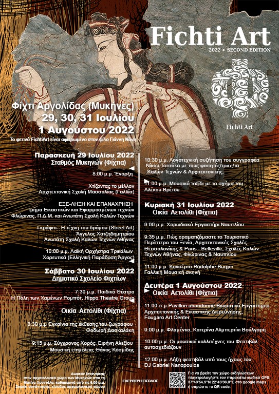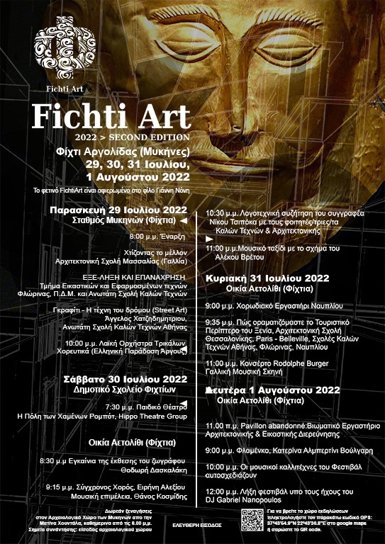 Το Σάββατο 30 Ιουλίου στο Δημοτικό Σχολείο Φιχτίων θα γίνει παράσταση παιδικού θεάτρου από την ομάδα Hippo Theatre Group. Στήν οικία Αετολίθι με θέα τις Μυκήνες και τον Αργολικό κάμπο, θα ακολουθήσουν έκθεση σύγχρονης τέχνης με τον εικαστικό Θόδωρο Δασκαλάκη σε επιμέλεια του Francesco Moretti, σύγχρονος χορός site-specific από την σπουδαία χορογράφο Ειρήνη Αλεξίου με καταγωγή από τους Μύλους Αργολίδας, με μουσική επιμέλεια Θάνου Κοσμίδη. Η βραδιά θα συνεχιστεί με συζήτηση του βραβευμένου συγγραφέα Νίκου Τσιπόκα από το Ναύπλιο με τις φοιτήτριες και τους φοιτητές των Σχολών Καλών Τεχνών και Αρχιτεκτονικής και θα τελειώσει με ένα μουσικό ταξίδι από τον βραβευμένο μουσικό με καταγωγή από το Άργος Αλέκο Βρεττό, που αναμιγνύει αραβική, τζαζ και λάτιν μουσική.