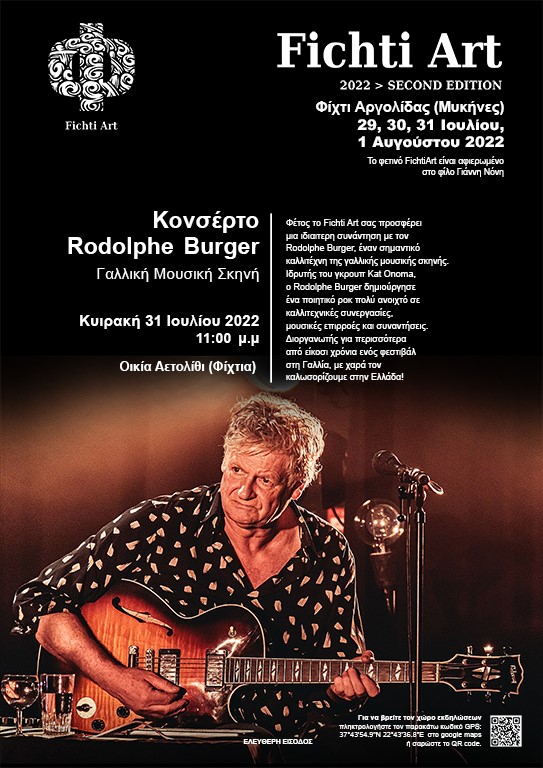 Η βραδιά θα τελειώσει με συναυλία με τον διάσημο Γάλλο ροκ μουσικό Rodolphe Burger και την Ειρήνη Αλεξίου να χορεύει στους ρυθμούς της μουσικής του.