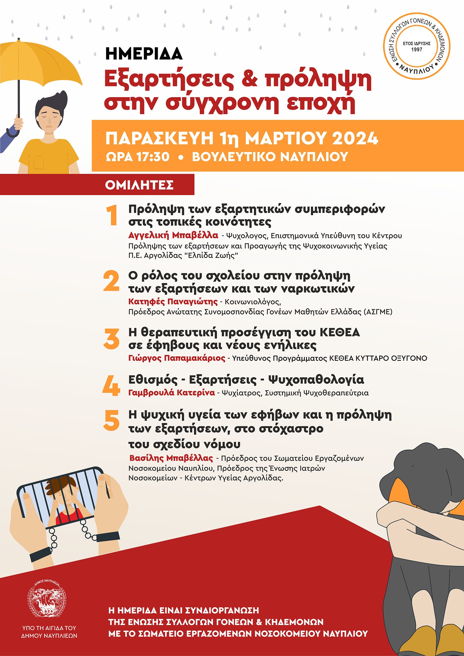 Η Ένωση Γονέων και Κηδεμόνων του Δήμου Ναυπλιέων και το Σωματείο Εργαζομένων στο Νοσοκομείο Ναυπλίου με τη συμμετοχή του ΚΕΘΕΑ ΚΥΤΤΑΡΟ ΟΞΥΓΟΝΟ, του ΟΚΑΝΑ Ελπίδα Ζωής , της Ψυχιατρικής Κλινικής Άργουςκαι της Ανώτατης Συνομοσπονδίας Γονέων Μαθητών Ελλάδας οργανώνουν ημερίδα με θέμα