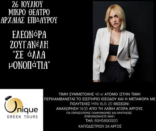 Την Παρασκευή 26 Ιουλίου, η Unique Greek Tours διοργανώνει μεταφορά με πολυτελές Mini Bus 20 θέσεων, από το Άργος και το Ναύπλιο για την παρακολούθηση της συναυλίας.