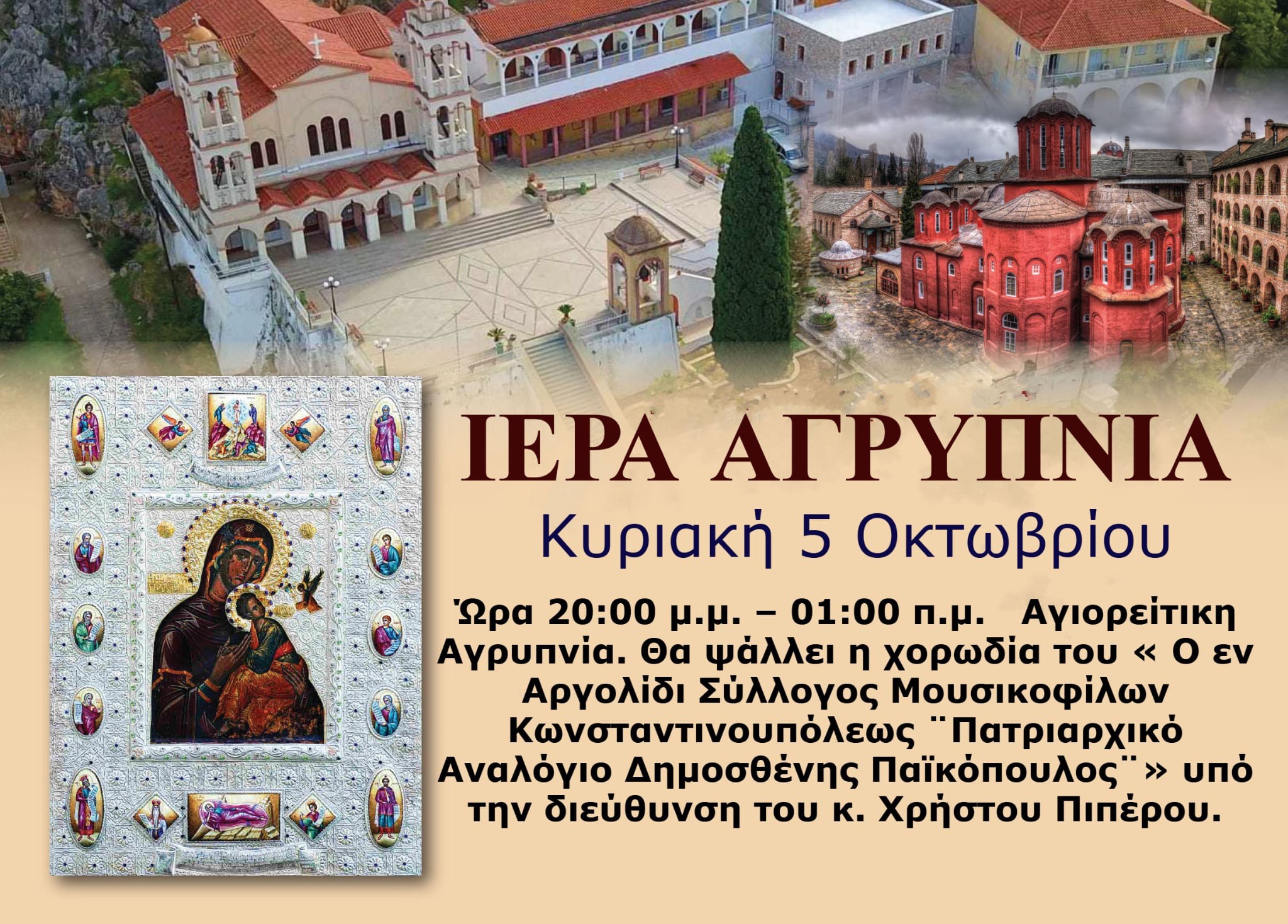 Την Κυριακή 5 Οκτωβρίου και ώρα 20:00 μ.μ. – 01:00 π.μ. θα πραγματοποιηθεί Αγιορείτικη Αγρυπνία στον Ιερό Ναό Ευαγγελίστριας Ναυπλίου, όπου βρίσκεται από τις 29 Σεπτεμβρίου