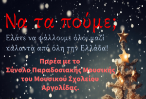 Το Μουσικό Σχολείο Αργολίδας, συμμετέχοντας στις χριστουγεννιάτικες εκδηλώσεις του Δήμου Ναυπλιέων, σας προσκαλεί σε εορταστική εκδήλωση που θα γίνει την Πέμπτη 18 Δεκεμβρίου 2025,