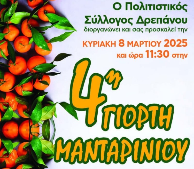 Η τέταρτη Γιορτή Μανταρινιού από τον Πολιτιστικό Σύλλογο Δρεπάνου, είναι γεγονός και θα πραγματοποιηθεί στο Δρέπανο του Δήμου Ναυπλιέων,