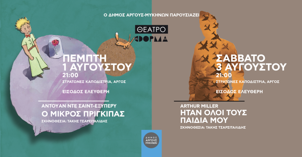 Το ΘΕΑΤΡΟ σε ΦΟΡΜΑ και ο Αργείος σκηνοθέτης Τάκης Τσαρσιταλίδης ξαναέρχονται στο Άργος και παρουσιάζουν στο πλαίσιο του «ΠΟΛΙΤΙΣΤΙΚΟΥ ΚΑΛΟΚΑΙΡΙΟΥ 2024», που διοργανώνει ο Δήμος Άργους-Μυκηνών, δυο κλασικά, έντονα συγκινητικά και διαχρονικά θεατρικά έργα! Πέμπτη, 1 Αυγούστου 2024, ώρα 21.00 Στρατώνες Καποδίστρια, Άργος Αντουάν ντε Σαιντ Εξυπερύ «Ο μικρός Πρίγκιπας» Ένας ύμνος στη φιλία και […]