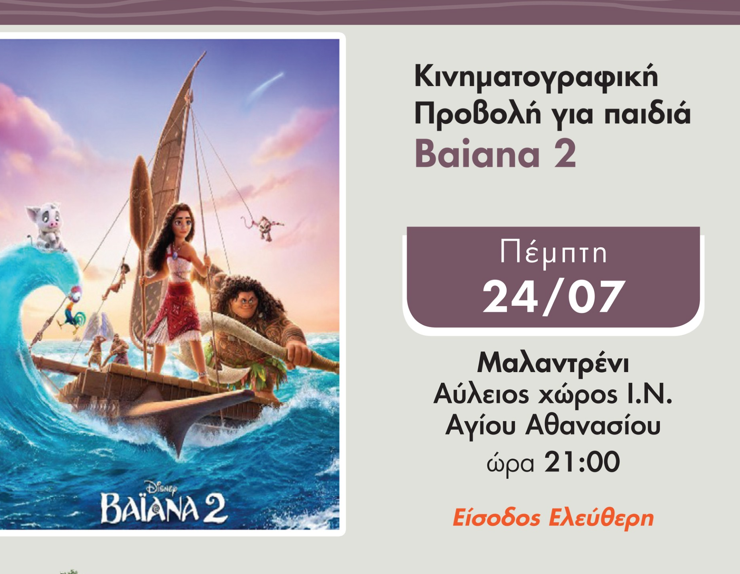 Απόψε Πέμπτη 24.07 (21:00) στον αύλειο χώρο του Ι.Ν. Αγίου Αθανασίου στο Μαλαντρένι, θα πραγματοποιηθεί η κινηματογραφική προβολή για παιδιά της ταινίας “Baiana 2”